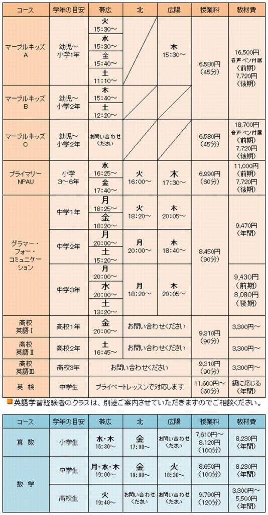 2022年度 時間割 札内教室/浦幌教室/大樹教室