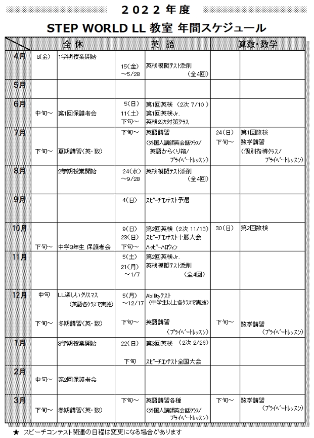 2022年度 時間割 大正教室/すずらん教室/芽室教室